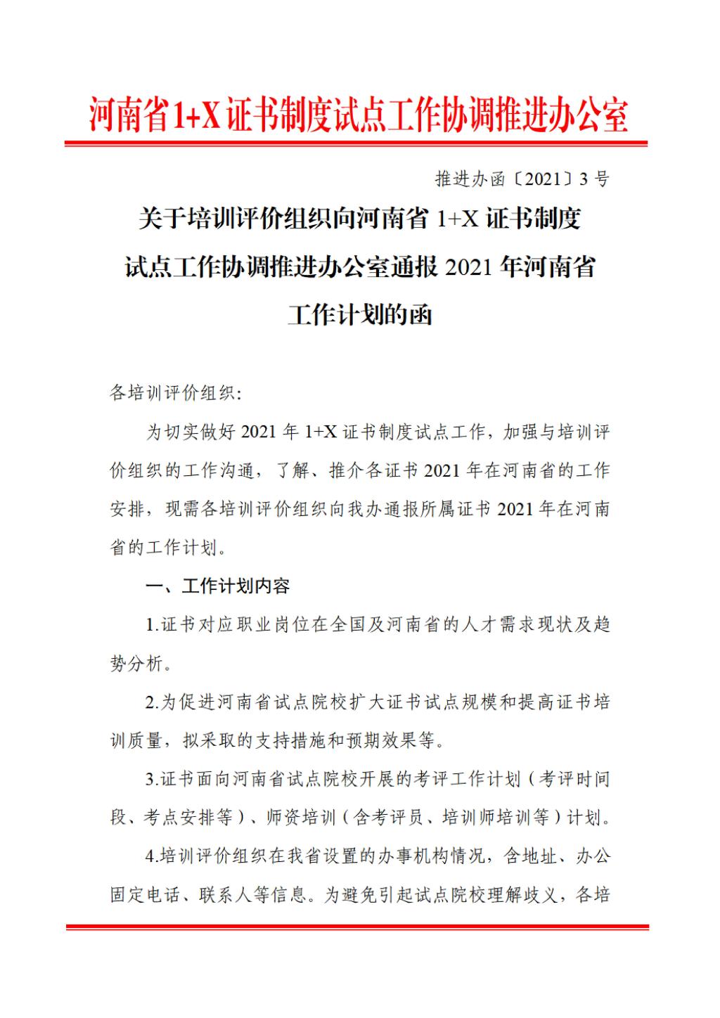 推进办函〔2021〕003号关于培训评价组织向河南省1+X证书制度试点工作协调推进办公室通报2021年河南省工作计划