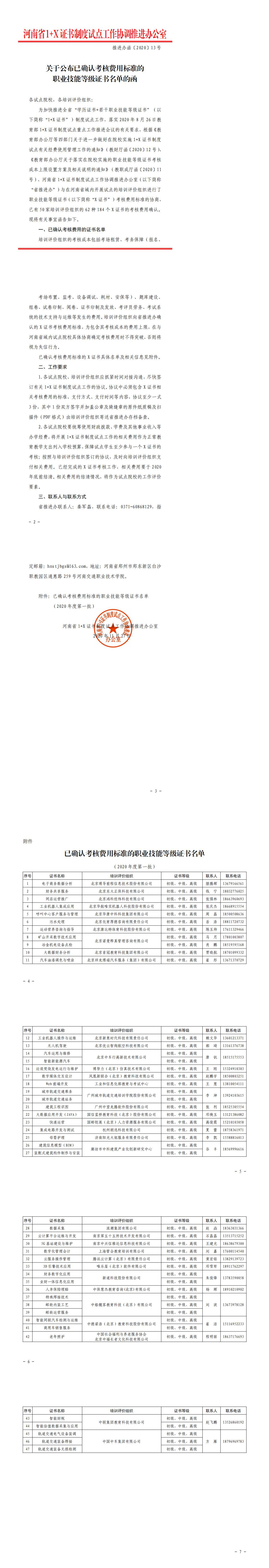 推进办函〔2020〕013号公布已确认考核费用标准的职业技能等级证书名单
