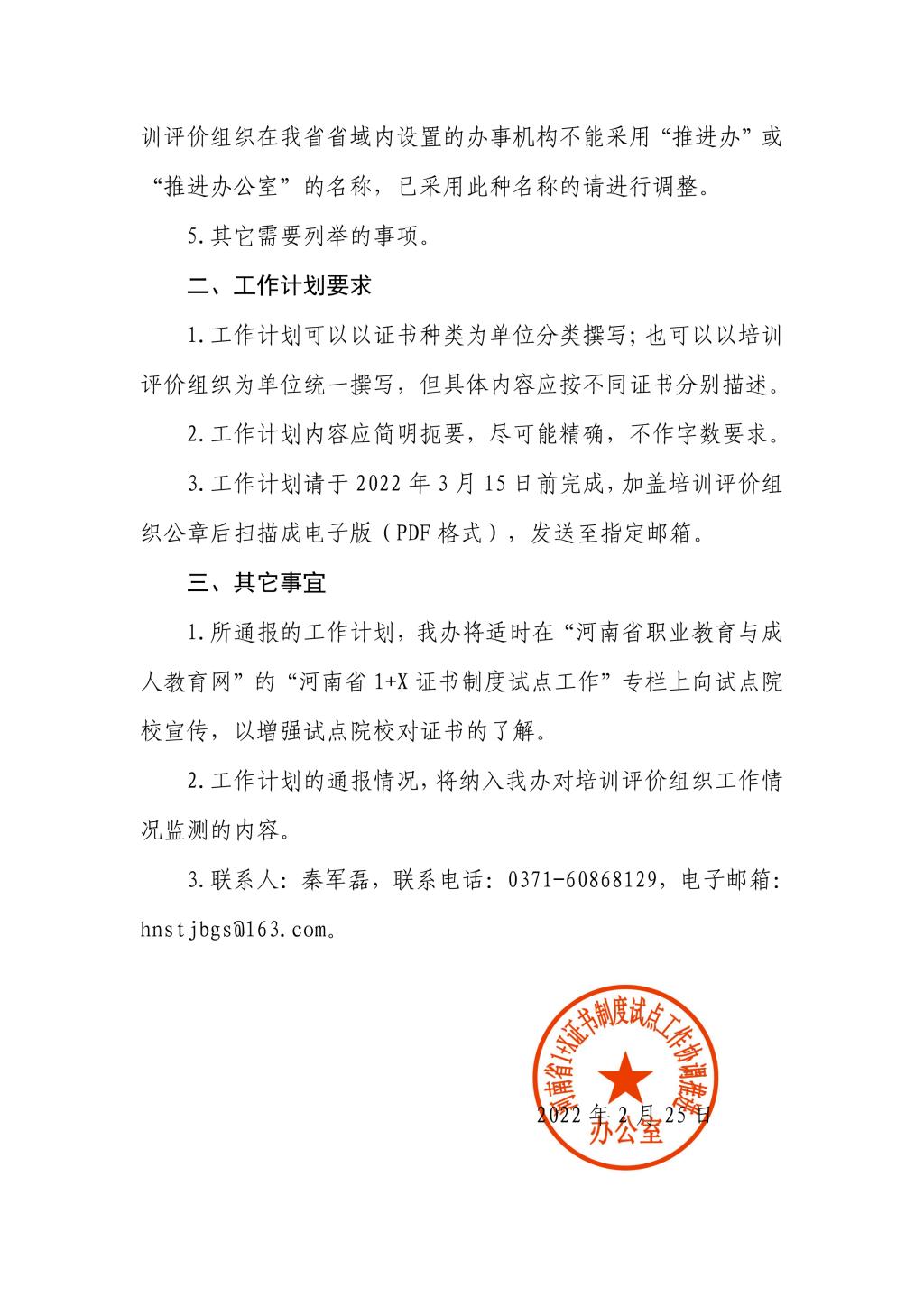 推进办函〔2022〕001号关于培训评价组织向河南省1+X证书制度试点工作协调推进办公室通报2022年河南省工作计划